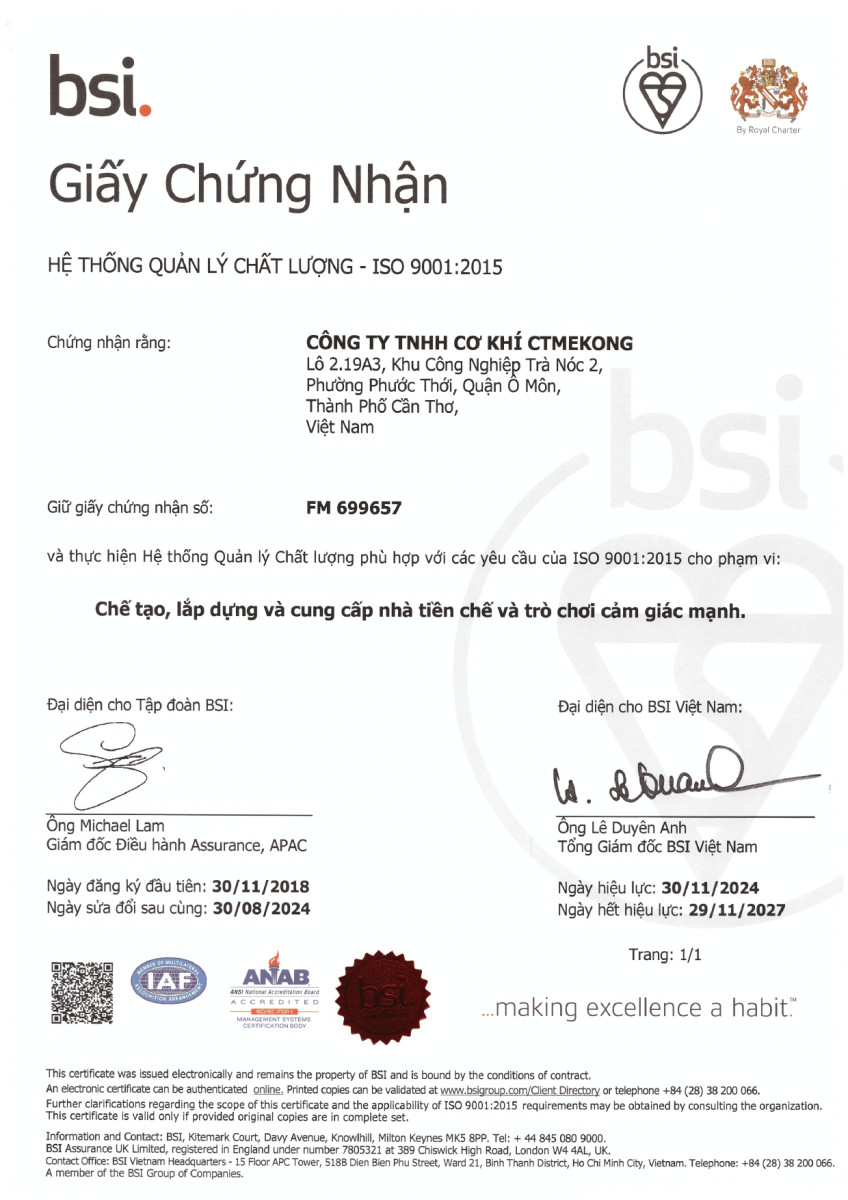 - Công ty chúng tôi sử dụng hệ thống ISO 9001 để quản lý chất lượng trong việc thiết kế, chế tạo, lắp dựng các sản phẩm mà công ty cung cấp.